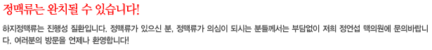 ÇÕº´ÁõÀÇ ¹ßº´ Àü¿¡ ÇÏÁöÁ¤¸Æ·ù°¡ ¹ß°ßµÇ¸é ºñ±³Àû ½¬¿î ¹æ¹ýÀ¸·Î Á¤¸Æ·ùÀÇ Ä¡·á°¡ °¡´ÉÇÏÁö¸¸ ¹æÄ¡µÇ°í Á¤¸Æ·ù°¡ ¾ÇÈ­µÇ¾î ½ÉÇÑ ÇÕº´ÁõÀÌ ¹ß»ýÇÏ¿´À» ½Ã¿¡´Â Á¤¸Æ·ùÀÇ Ä¡·á»Ó ¾Æ´Ï¶ó ±× ¿ÜÀÇ º¹ÇÕÀûÀÎ Ä¡·á°¡ ÇÊ¿äÇÕ´Ï´Ù. µû¶ó¼­ Á¶±â¿¡ Á¤¸Æ·ù°¡ Áø´ÜµÈ ºÐµéÀº ·¹ÀÌÀú µîÀ» ÅëÇÑ ½Ã¼ú·Î º¸´Ù ¾ÇÈ­µÇ±â Àü¿¡ Ä¡·áÇÏ´Â °ÍÀÌ Çö¸íÇÑ ¹æ¹ýÀÔ´Ï´Ù. ¾à°£ÀÇ Æ¢¾î³ª¿Â Á¤¸ÆÀ̳ª ½ÇÇÍÁÙÀÌ º¸ÀÌ´õ¶óµµ ½ÇÁ¦ ÃÊÀ½ÆÄ»ó Á¤¸ÆÀÇ ¿ª·ù°¡ È®ÀεǴ °æ¿ì°¡ ¸¹À¸¹Ç·Î ¹Ýµå½Ã º´¿ø¿¡¼­ Ä®¶óµµÇ÷¯ ÃÊÀ½ÆÄ°Ë»ç·Î ¿ª·ùÀ¯¹«¸¦ È®ÀÎÇÏ½Ç °ÍÀ» ±ÇÇØµå¸³´Ï´Ù.