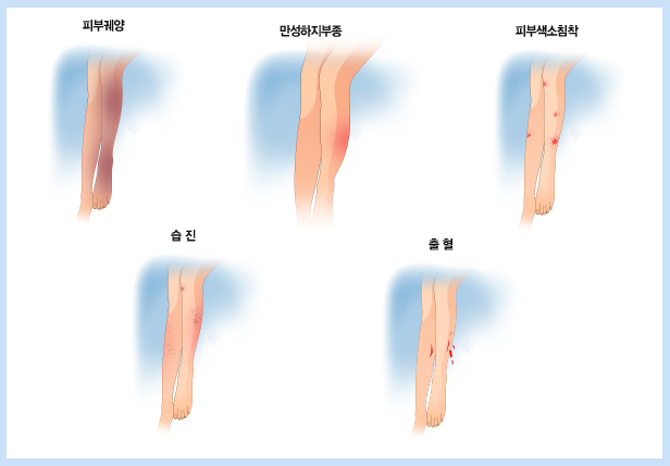 | ÇǺΠ°¢¹Ý Çö»ó(Sign of Gougerot)Àº ´Ù¸®ÀÇ ÇϺÎ, ¹ß ºÎºÐÀ» ¿±ÃÊó·³ °¨½Î´Â °¢¹Ý ¸ð¾çÀÇ ´Ü´ÜÈ÷ °æÈµÈ ÇǺÎÀÇ ºñÈļº º¯È¸¦ ¸»ÇÑ´Ù. ÀÌ·± ÇǺΠ°æÈ¿¡ ÀÇÇØ ÀÓÆÄ ¼øÈ¯ÀÌ Â÷´ÜµÇ¾î Àӯļº ºÎÁ¾À» ÀÏÀ¸Å°°í ÀÌ·Î ÀÎÇØ ±Ë¾çÀÇ ¹ß»ýÀ» Á¶ÀåÇϰųª, ÀÌ¹Ì Á¸ÀçÇÏ´Â ±Ë¾çÀÇ Ä¡À¯¸¦ ¹æÇØÇϸç Á¶Á÷ÀÇ »ê¼Ò °áÇÌÀ» ¾ÇȽÃŵ´Ï´Ù. |