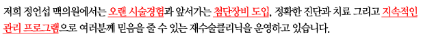 Á¤¾ð¼· ¸ÆÀÇ¿ø¿¡¼­´Â º´¿ø Ä¡·á°¡ ³¡³­ ÈÄ¿¡µµ Áö¼ÓÀûÀÎ °ü½É°ú ¿À·£ °æÇèÀ¸·Î ¸¸µé¾îÁø öÀúÇÑ »çÈÄ °ü¸® ÇÁ·Î±×·¥ÀÎ ¡®AFTER-CARE Program¡¯À» ÅëÇØ ¿ÏÀüÇÑ ¿ÏÄ¡°¡ µÉ ¶§±îÁö ¸î ³âÀÌ °É¸®´õ¶óµµ ³¡±îÁö Áö¼ÓÀûÀÎ °ü¸®¸¦ ÅëÇØ ÃÖ¼±À» ´ÙÇϸç Àç¹ß·ü 0%¸¦ À§ÇØ ³ë·ÂÇÕ´Ï´Ù.